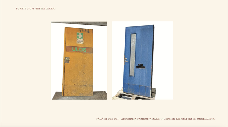 Näyttelyssä on mukana myös Research Fellow Laura Bergerin vetämä Rakennuskato-projekti, jonka näyttely Tämä ei ole ovi – absurdeja tarinoita rakentamisesta muistuttaa absurdeista tilanteista mitä kiertotalous- ja korjaushankkeissa tulee vastaan lainsäädännössä, joka suosii purkamista ja uuden rakentamista. Juhlapuheista huolimatta Suomi on vielä kaukana EU:n jätedirektiivin tavoitteesta, joka edellyttää 70 prosentin kierrätysastetta rakennusjätteelle. Rakennuskato haluaa näyttelyllään herättää keskustelua siitä, miksi nykyiset kiertotalouden ihanteet ja poliittiset linjaukset ovat niin kaukana rakennusteollisuuden arjesta.