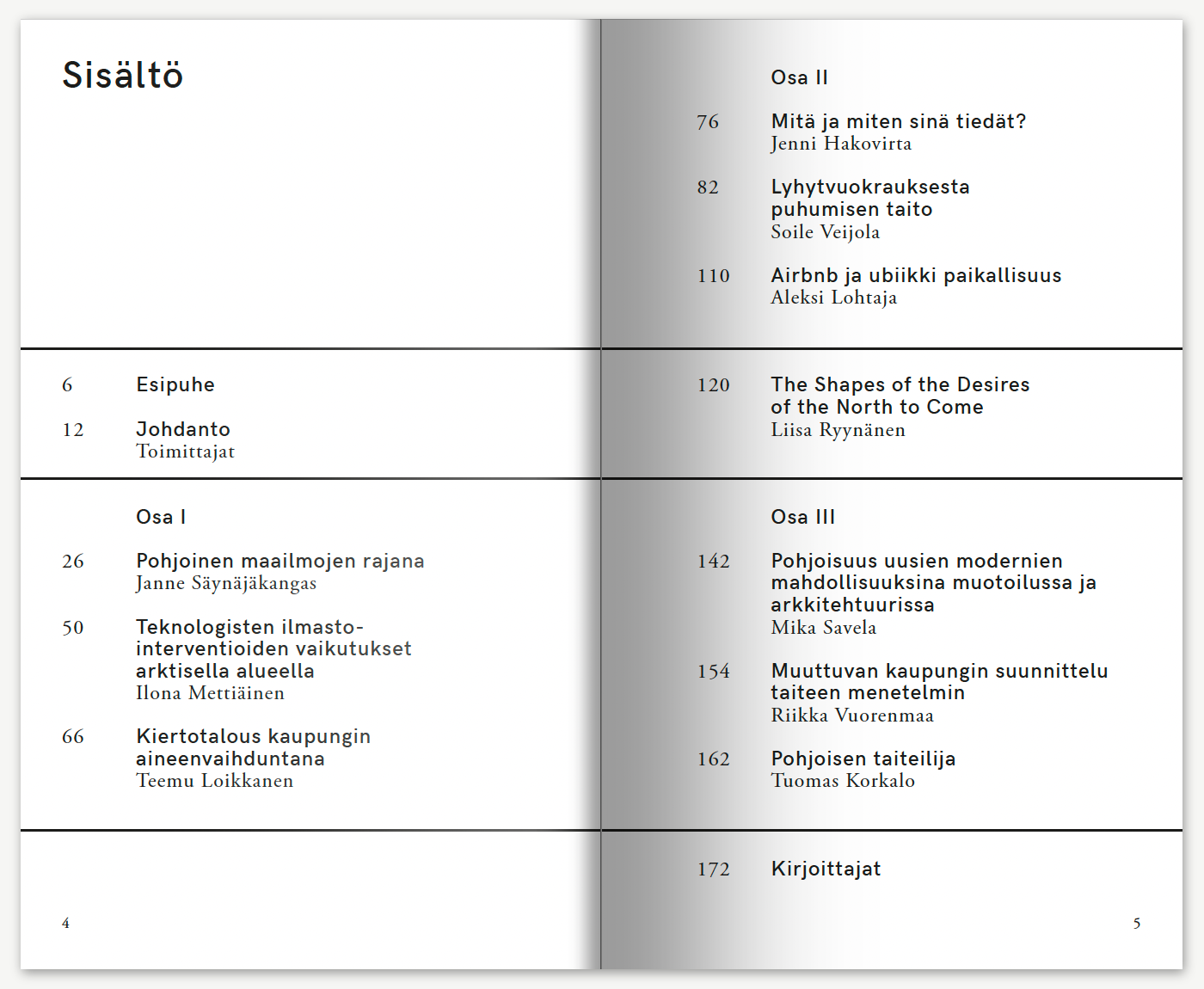 Kirjan teemoja ovat pohjoisuuden idea, ilmastonmuutos, kiertotalous, alkuperäiskansojen tieto, alustatalouden muotoileman turismin vaikutukset yhteisöihin ja arkkitehtuuriin, modernismin ja pohjoisen suhde arkkitehtuurissa, taiteen menetelmät kaupunkisuunnittelussa sekä pohjoinen taiteilijuus.